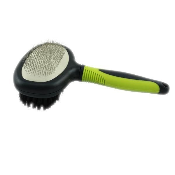 Ergonomiczny kształt rączki oraz antypoślizgowe elementy zapewniają pewny chwyt i wygodne użytkowanie szczotki. Z jednej strony szczotka posiada nylonowe włosie do wygładzenia oraz nadania połysku szacie zwierzęcia. Natomiast druga strona przeznaczona jest do dokładnego wyczesania psa z martwego włosa, kurzu i brudu.