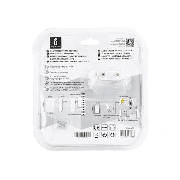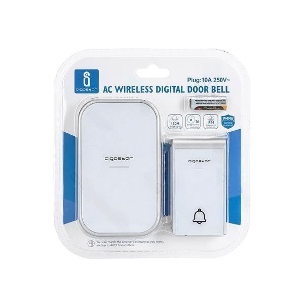 Nowoczesny, dzwonek do drzwi zasilany bakteryjnie. Dzięki zwiększonej odporności (IP44) oraz zasięgu do 150m może być umieszczony przed drzwiami lub furtką. Bezprzewodowy, wodoodporny dzwonek do drzwi zapewni bezproblemową obsługę wszelakich gości.