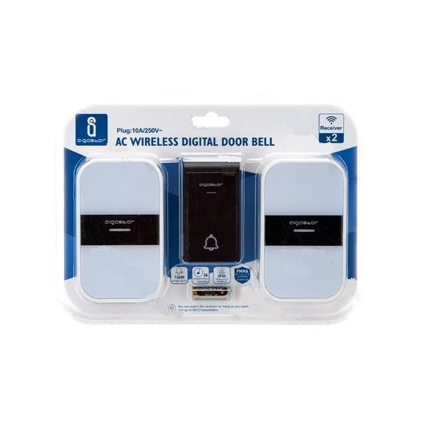 Nowoczesny, dzwonek do drzwi zasilany bakteryjnie z 2 odbiornikami. Dzięki zwiększonej odporności (IP44) oraz zasięgu do 150m może być umieszczony przed drzwiami lub furtką. Bezprzewodowy, wodoodporny dzwonek do drzwi zapewni bezproblemową obsługę wszelakich gości.